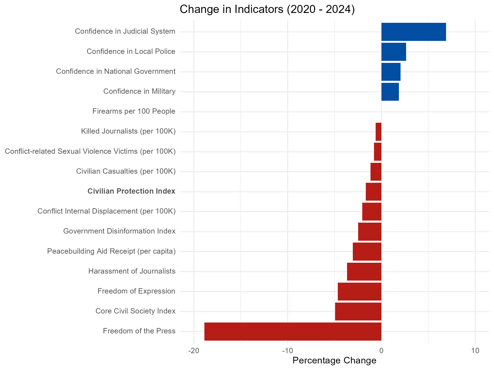 Over the longer term, since 2020, the civilian protection environment has worsened in all the regions monitored (see Figure 1 above), while the situations in Afghanistan, Lebanon, Myanmar, the oPT, and Sudan deteriorated the most. This reflects the growing numbers of civilian casualties and, in the case of Afghanistan, the abrupt takeover by the Taliban—an authoritarian regime imposing severe restrictions on individual rights, particularly for women and girls. Since 2020, all indicators measured by CIVIC have worsened, except those that measure trust in state institutions (see Figure 2).